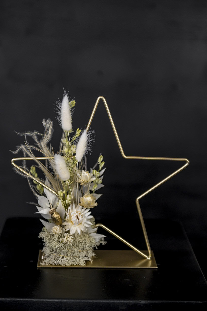 handgefertigtes Trockenblumengesteck auf goldenem Metallstern