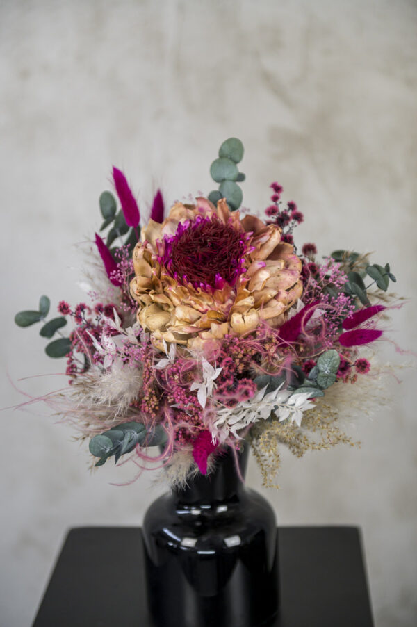 Zart, modern und mit einem Hauch Luxus – „pink elegance“ verkörpert feminine Leichtigkeit und stilvolle Raffinesse. In der Komposition vereinen sich pinke Infinity-Rosen mit edlen getrockneten Proteen und einer außergewöhnlichen gefärbten Artischocke, die als ausdrucksstarker Mittelpunkt fungiert.