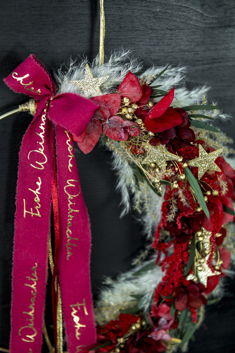 handgefertigter Trockenblumen-Hoop im modernen Christmas-Look